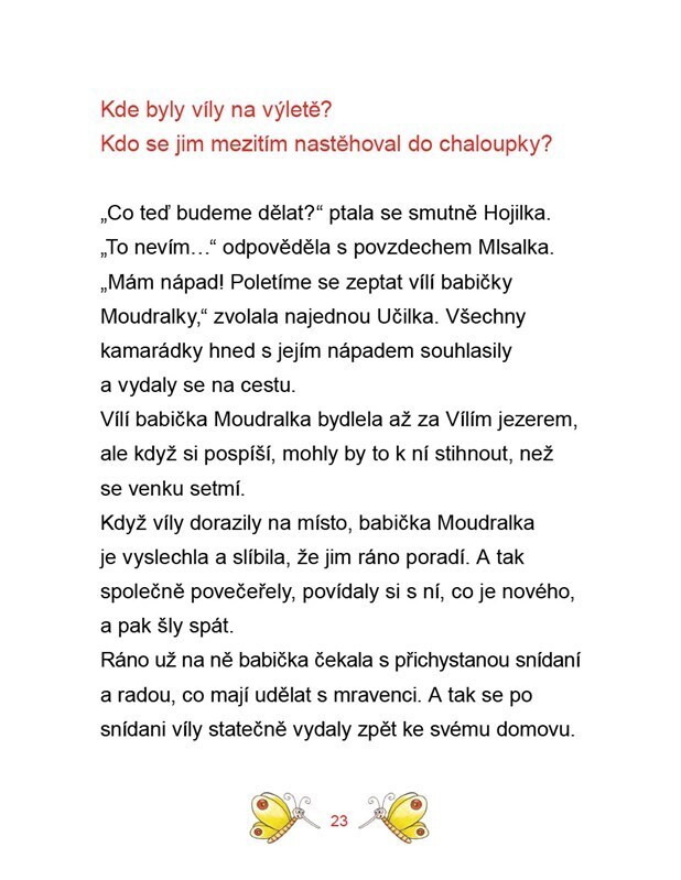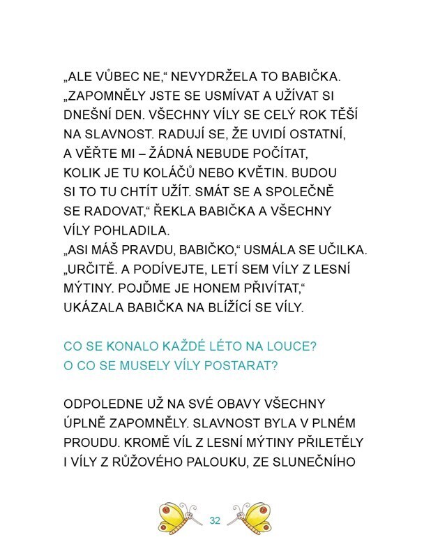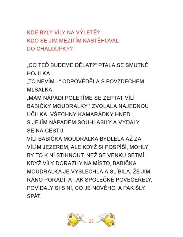 V lipové aleji, za malými dvířky, je ukrytý Kouzelný palouk. Na něm stojí lípa a v ní bydlí víly Hojilka, Spinkalka, Pořádnička, Učilka a Mlsalka. Zajímá tě, jak vyřešily záhadu slané kaše nebo jak si poradily s nezvanou návštěvou? Tak se honem pusť do čtení. Pohádky doplněné krásnými...