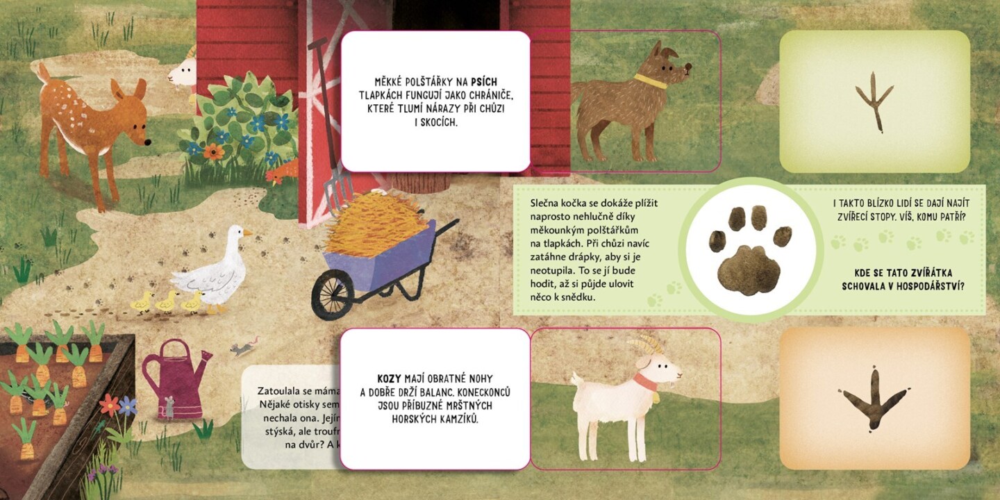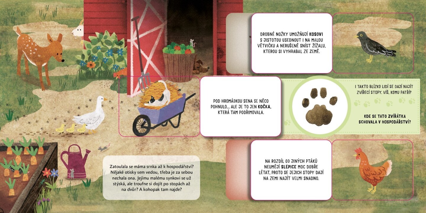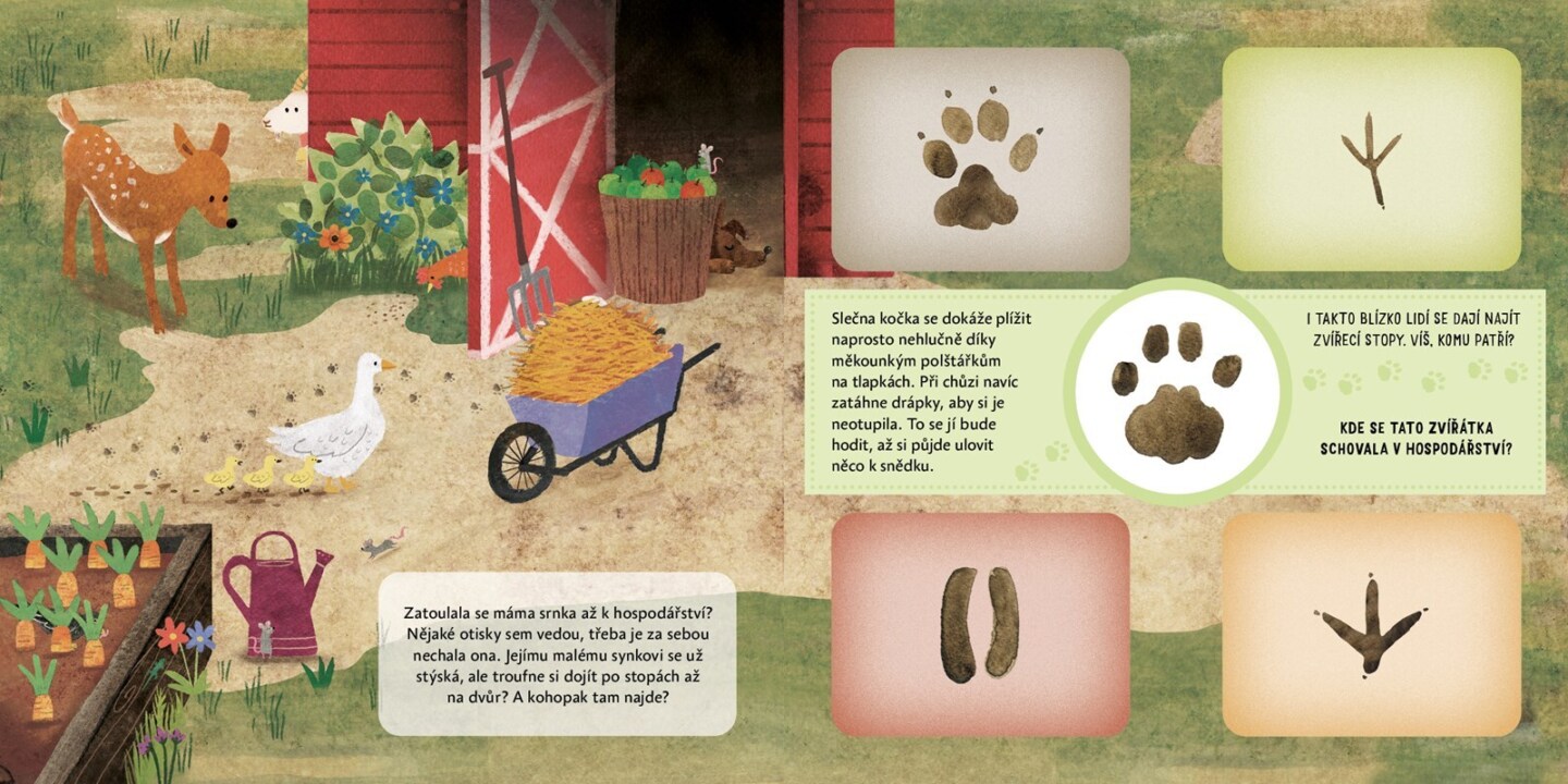 Co byste si počali, kdybyste se ztratili v lese? Jednomu malému srnečkovi se to přihodilo. Nešťastný a zmatený se vydává hledat svou maminku a nechává se vést řádkou stop obtisknutých v lesní půdě. Ale nechala je za sebou opravdu máma srnka, nebo tudy šel někdo jiný? Na své výpravě se srneček...