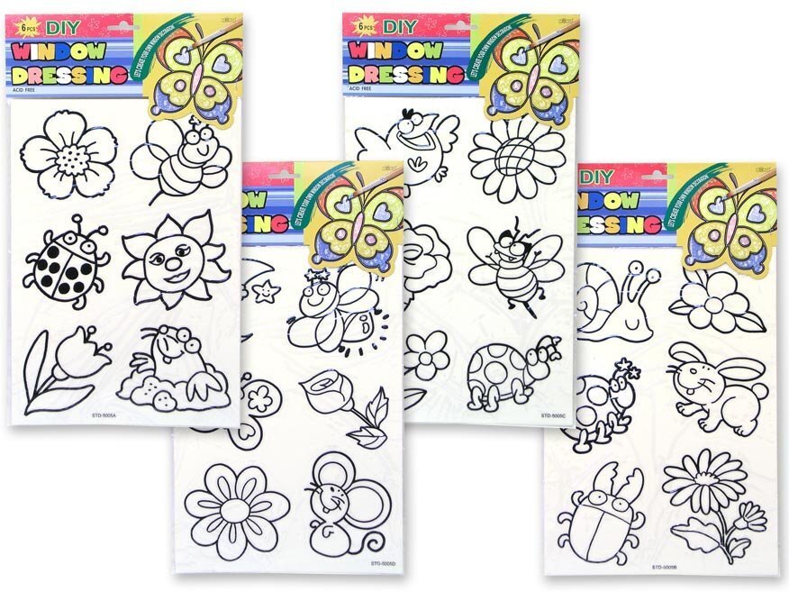 Předlohy na malování na sklo s vyvýšenou konturouADHÉZNÍ FÓLIE ELEKTROSTATICKY PŘILNE K POVRCHU!Vybarvěte a po uschnutí umís...