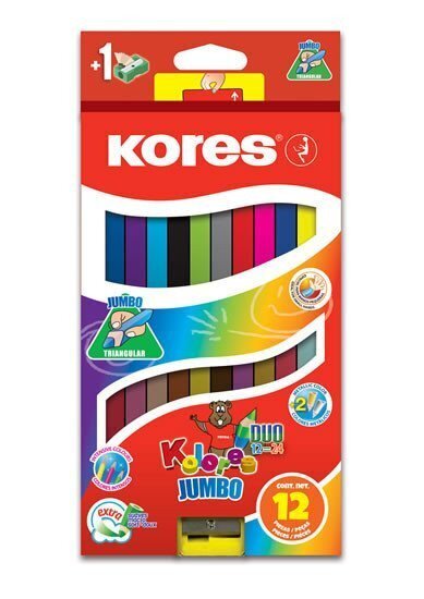 Kores Jumbo DUO trojhranné pastelky 5 mm s ořezávátkem 12 barev + 2 metalické barvy