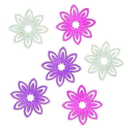 Dřevěné kytičky v růžové, fialové a bílé barvě jsou určeny k vytváření dekorací....