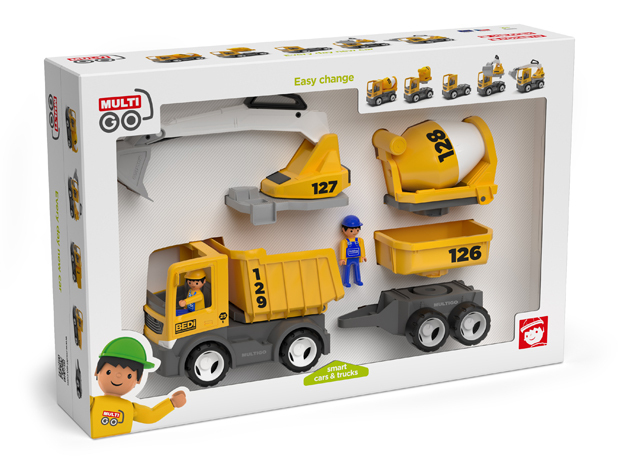 Stavební sada BEDI nabízí 4 typy vozidel v jednom balení. Ideální balení pro kreativní děti, které rozehrávají svou hru na stavbaře. Sada obsahuje jedno auto, 2 Igráčky stavbaře a 4 korbičky: bagr, domíchávač, sklápěčku a valníček.