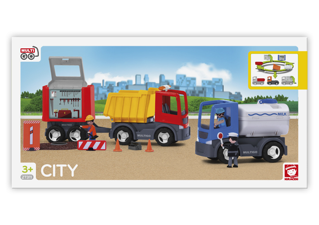 Sada obsahuje červené a modré auto s majáky, tři korbičky: cisternu na mléko, sklápěčku a multikorbičku hasiči / mechanici. Součástí jsou také tři Igráčci včetně příslušenství.