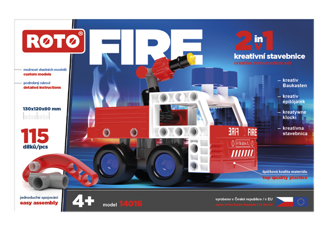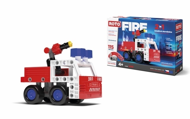 Sestav hasičské auto a spěchej k požáru. ROTO 2v1 - vstupní brána do světa snadného skládání složitých věcí. Libovolně kombinovatelné s dalšími stavebnicemi ROTO. Vyrobeno v ČR z vysoce kvalitních plastů. Obsahuje 115 dílků.