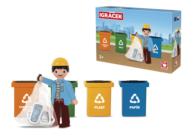 Čtyři kontejnery na tříděný odpad a Igráček, který myslí na přírodu.Ideální hračka, která učí děti, jak správně třídit odpad.Vhodné pro děti od 3 let.Vyrobeno v České republice.