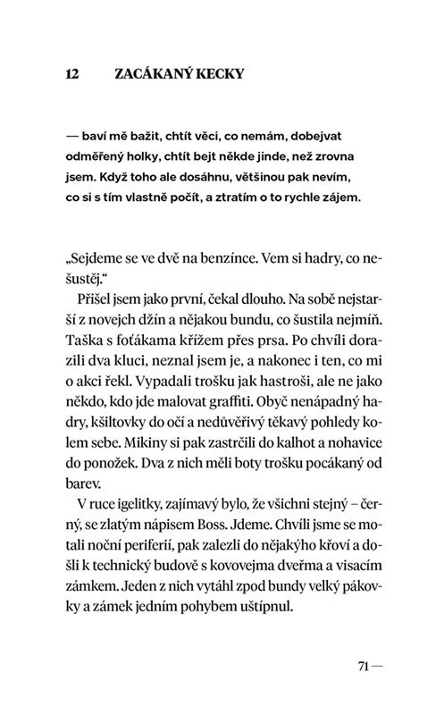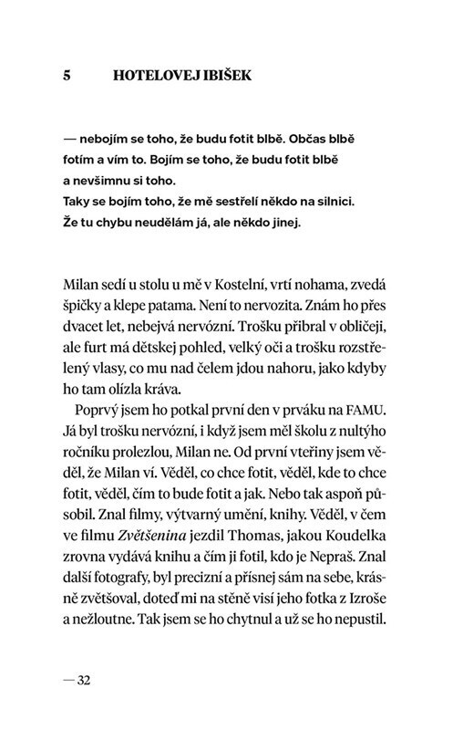 Vždycky jsem chtěl víc, než jsem měl. Občas fotím blbě a vím to. Nemám rád tykání cizím lidem, rozkopaný boty v předsíni a povídání si o jídle. Rád bych vzal zpátky plno věcí, co jsem řekl a udělal. Chtěl bych projet prázdnou noční Blankou z Tróje na Barrandov Mustangem Bullitt se staženejma...