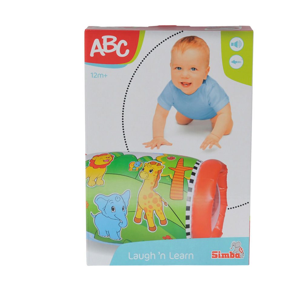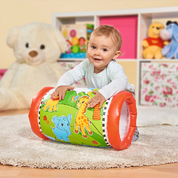 Nafukovací válec s potiskem zvířatek, ze stran průhledný, uvnitř 2 chrastící kuličky. Rozměry cca 44 x 25 cm.