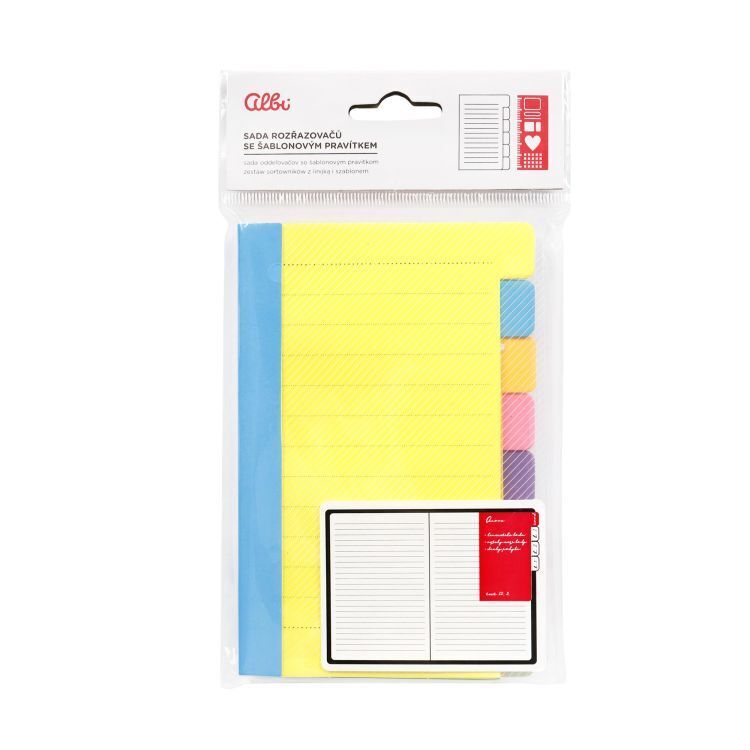 Sada rozřazovačů do bloku s pravítkem obsahuje bloček s barevnými aršíky určenými k dotvoření nedatovaného bloku či diáře.