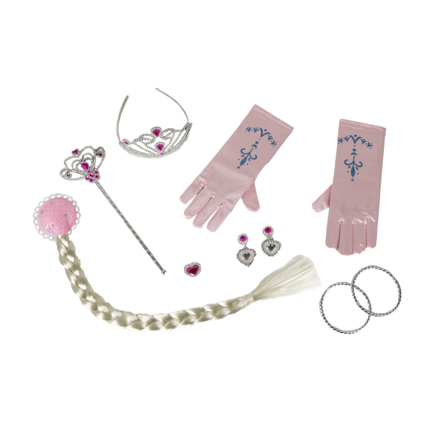Exkluzivní sada pro všechny malé princezny! Krásná korunka s náušnicemi, prstýnky, hůlkou, náramky a rukavicemi. Doplňky jsou zdobeny růžovými prvky. Součástí je dlouhý cop v blond provedení. Perfektní sada ke kostýmu! Doporučeno pro děvčata od 3 let.