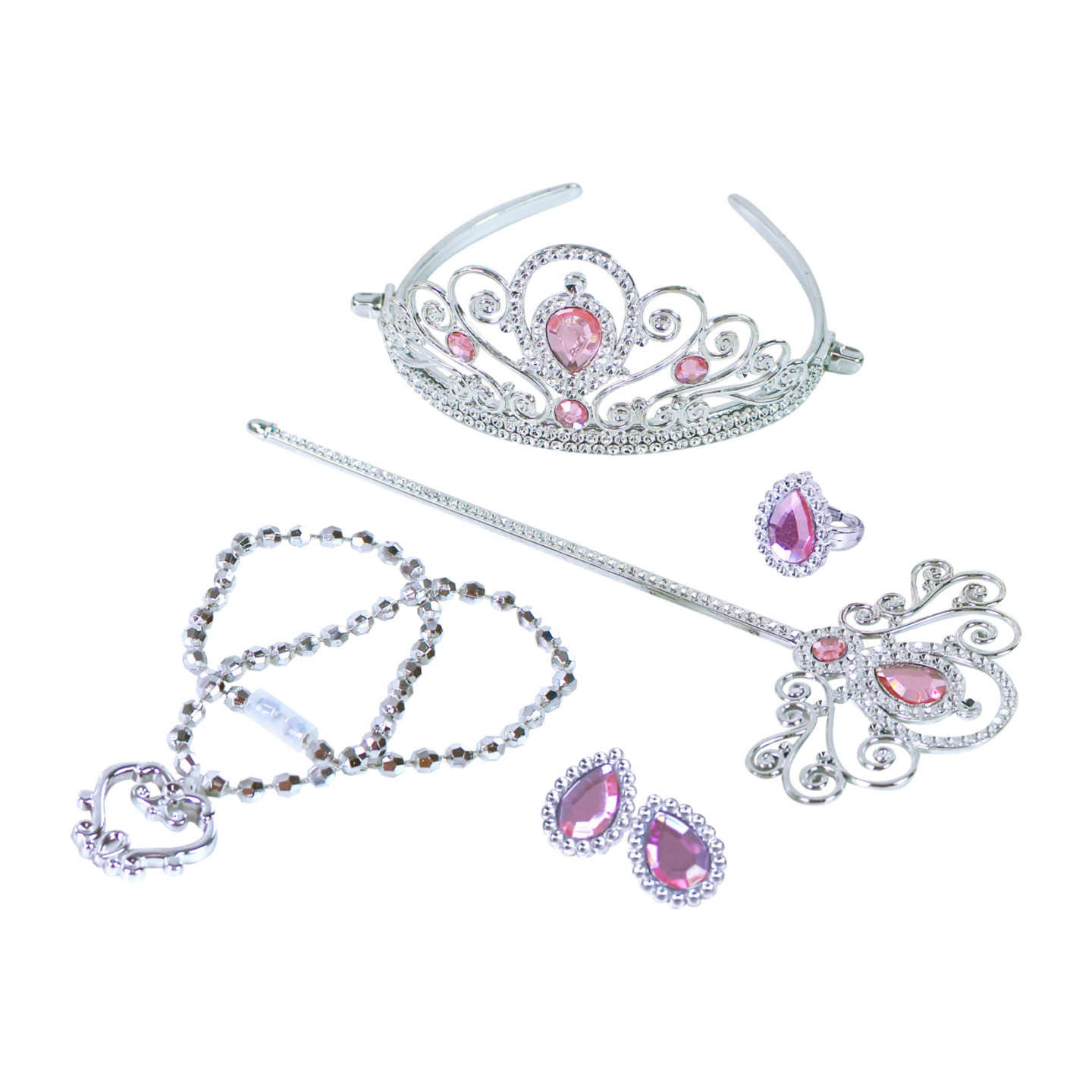 Krásná korunka s náušnicemi, náhrdelníkem, prstýnkem a hůlkou. Doplňky jsou zdobeny růžovými prvky. Perfektní sada ke kostýmu! Doporučeno pro děvčata od 3 let.
