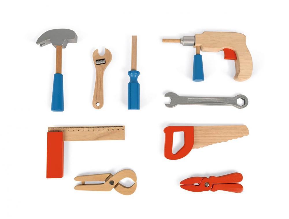 Kufřík, který obsahuje vše potřebné pro začínající kutily. Snadno se přenáší díky svým malým dřevěným držadlůmObsahuje 9 nástrojů.Vhodné pro děti od 3 let.