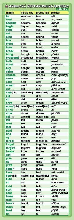 Praktická záložka obsahuje tvary minulého času a příčestí minulého nejužívanějších nepravidelných sloves....