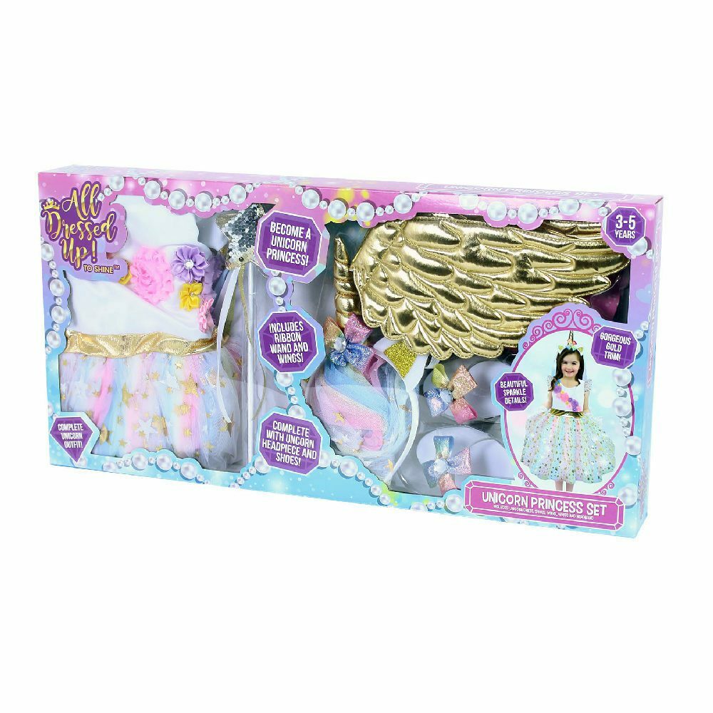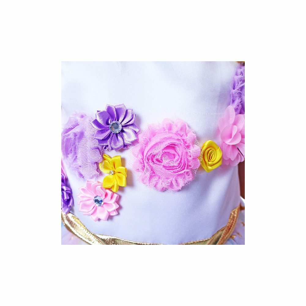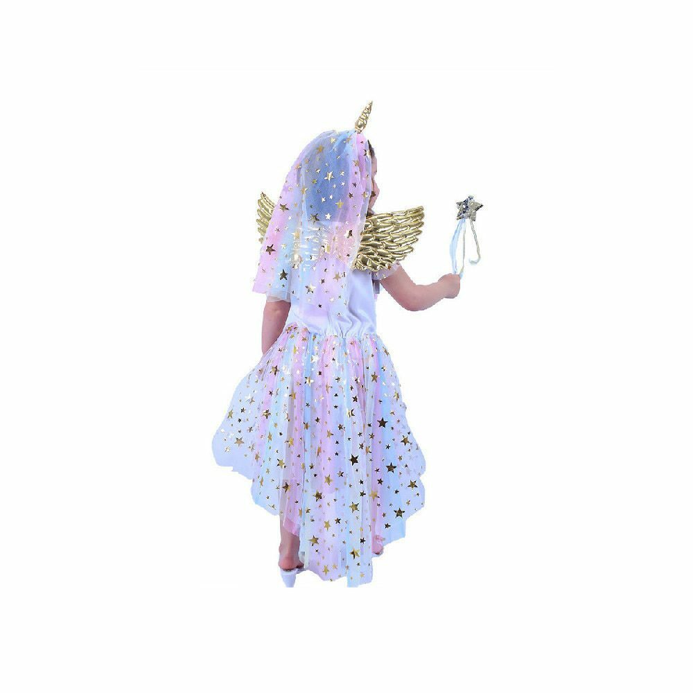 Kostým jednorožec v krabici. Sada obsahuje kromě samotného kostýmu také střevíčky, čelenku a křídla. To vše s motivem jednorožce. Šatičky jsou učeny pro děvčata ve věku 4 - 6 let. Rozměr šatiček od ramen dolů je cca 66 - 80 cm. Obvod pasu cca 58 - 60 cm. Velikost střevíčků je cca 19...
