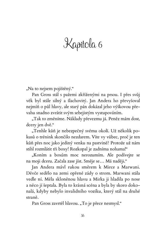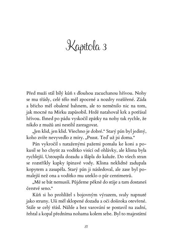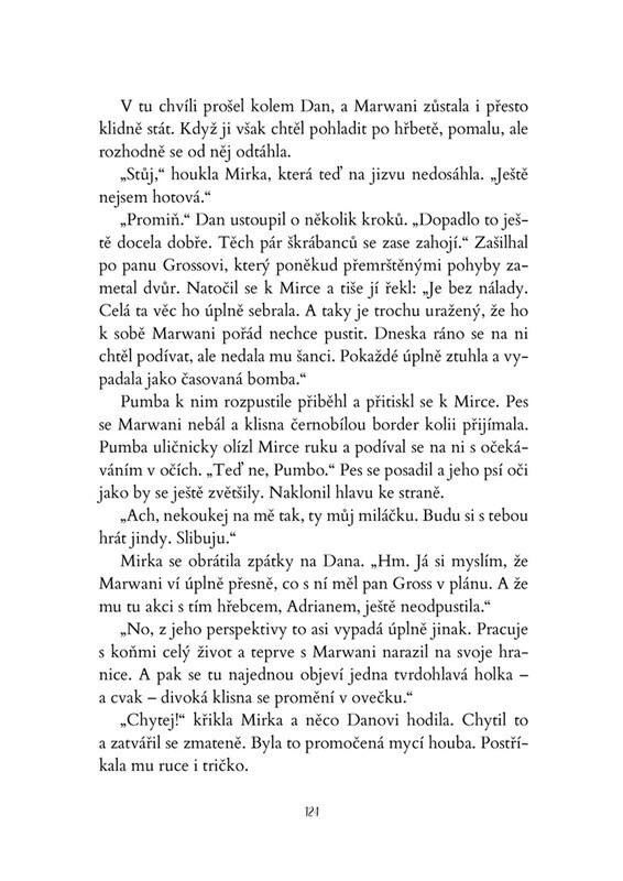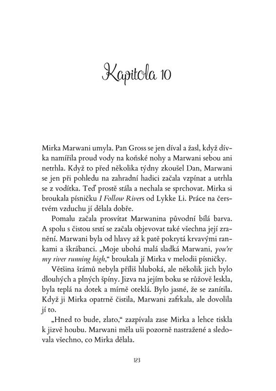 Když se Mirka ocitla na invalidním vozíku, přišla o všechny kamarády. A když její rodiče ještě ke všemu koupí starý dům přímo vedle hřebčína, pohár přeteče. Ale potom přikluše do jejího života Marwani. Bílá klisna je divoká, sebevědomá a nezkrotná – přesně taková, jaká bývala Mirka, než se jí...