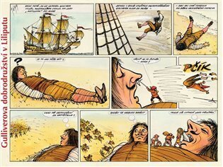 Guliverova dobrodružství v Liliputu v komiksové skládačce (leporelu).