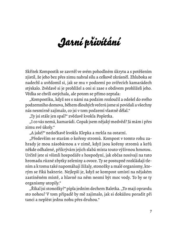 Když se po zimě objeví Kompostík znovu na zahrádce, večerní setkávání a nová dobrodružství s jeho zvířecími kamarády mohou pokračovat. Skřítek zvířátkům vypráví o své zimní práci v podzemí, péči o kořeny stromů a významu kompostu. Volné pokračování prvního dílu knížky o skřítkovi Kompostíkovi...