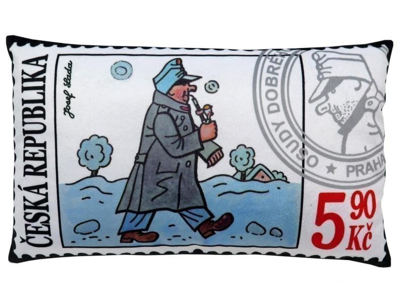 Měkký polštář s motivem dobrého vojáka Švejka od Josefa Lady, vhodný na cesty i jako dekorace. Materiál mikrovelur, obrázek tisk...