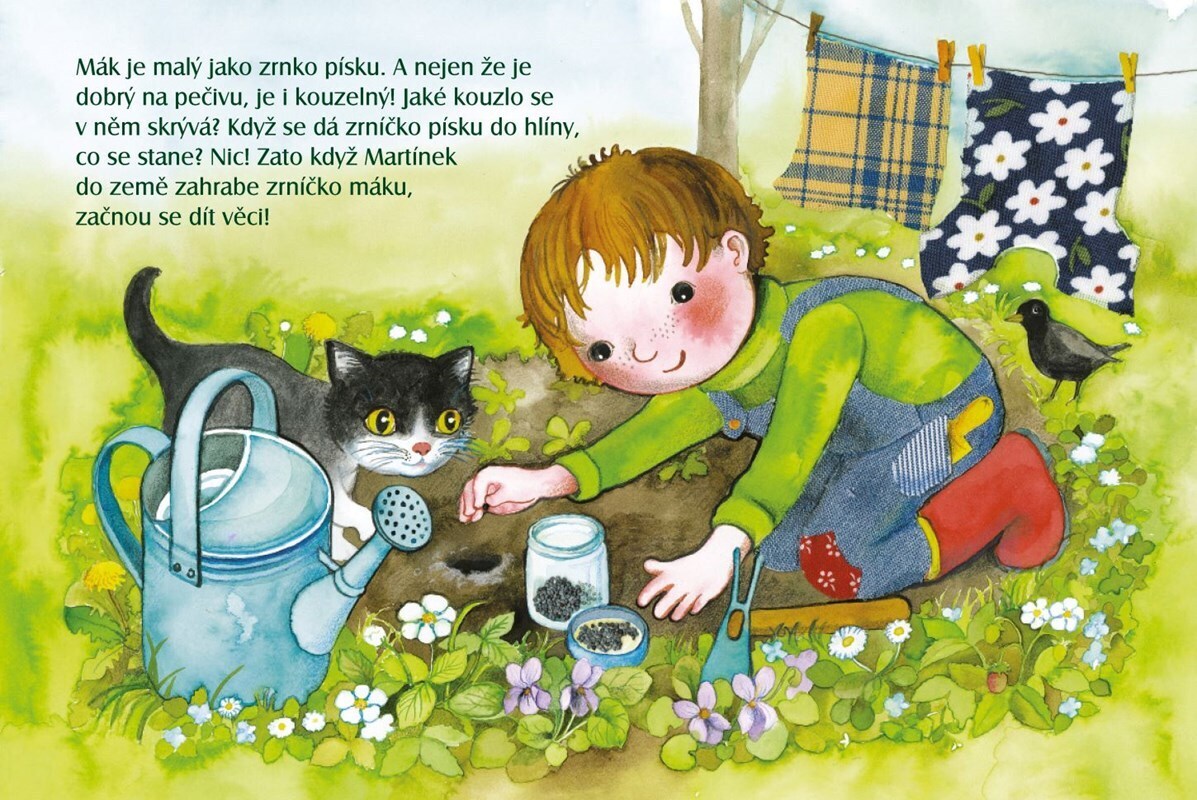 Martínek pomáhá mamince válet těsto na preclíky. Ale než je maminka dá péct, posype je tmavými kuličkami. Copak to je? Máček! Martínek se rozhodl vypátrat, jak takové makové semínko vzniká. Mák je hezká a dobrá rostlinka, a než si pochutnáme na makových koláčích či buchtách, má před sebou hodně...