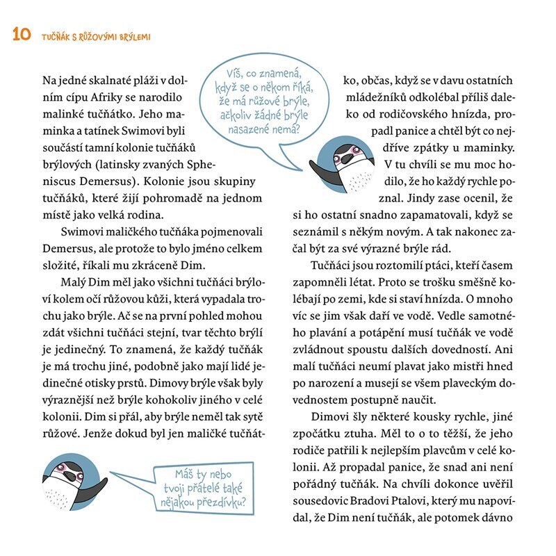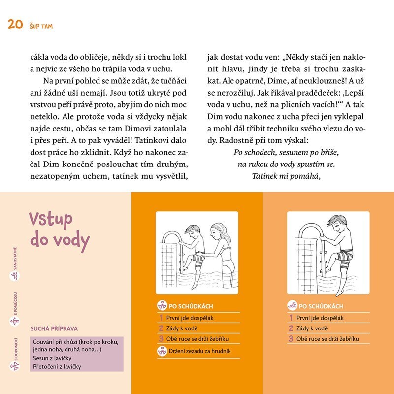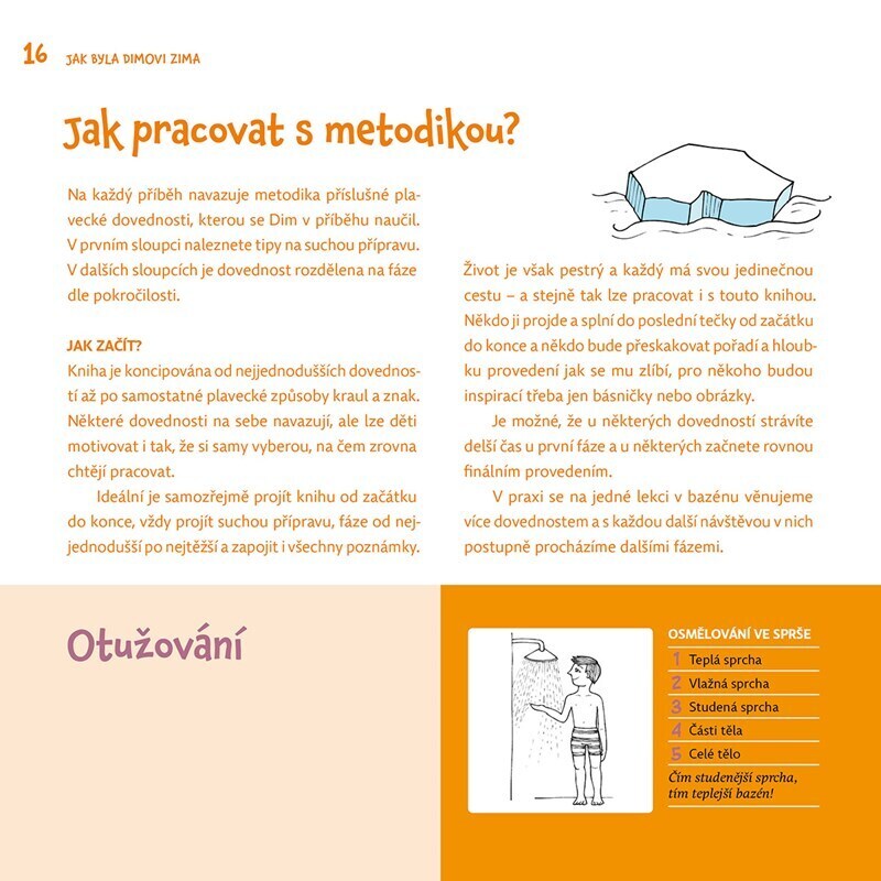 Pomocí pohádek o malém tučňákovi Dimovi, který se učí plavat, můžete naučit své děti základní plavecké dovednosti, např. dýchat do vody s tučňáčicí Bublinkou, vznášet se s hvězdicí Aster, skákat šipku s delfínicí Špičkou a dalších celkem 22 základních plaveckých dovedností. A nakonec i plavat...