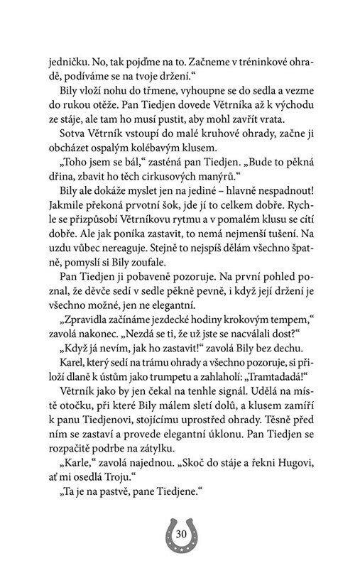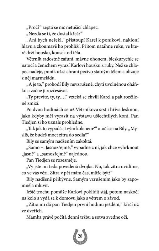 Největší láskou dvanáctileté Bily jsou koně. Po ničem na světě netouží víc než vyhoupnout se do sedla. Když jí osud postaví do cesty cirkusového poníka Větrníka, okamžitě si získá její srdce. Začínají prázdniny, ale Bily má plné ruce práce: pomáhá ve stájích, stará se o nového čtyřnohého...