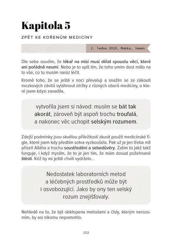 Tato kniha je o odvaze žít. Kristina Höschlová v ní podává neuvěřitelná svědectví z válečných zón v Afghánistánu, Kurdistánu a Jemenu, kde pracovala jako lékař-anesteziolog. Popisuje skutečné příběhy místních lidí, své zážitky i svět emočních kontrastů, v němž se krutost mísí se srdečností,...