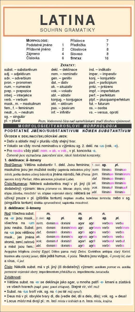 Koncentrovaný přehled sumarizuje učební látku – tvarosloví, skladba. Přehledné členění, grafická úprava a volba barev umožňuje r...