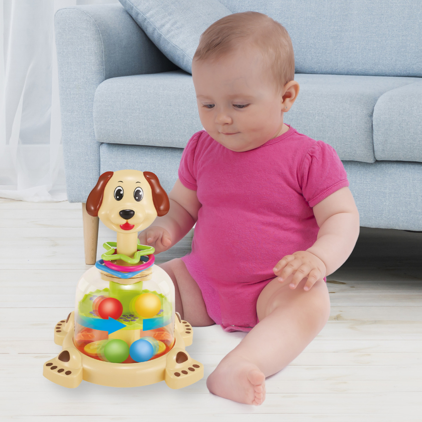 Pestrobarevný mechanický kolotoč ve tvaru psa je naplněný barevnými kuličkami, které budou po zmáčknutí hlavy rotovat, skákat a vydávat chrastící zvuk.Tato hračka zaujme a pobaví i ty nejmenší děti. Barvy se mohou lišit od vyobrazení.