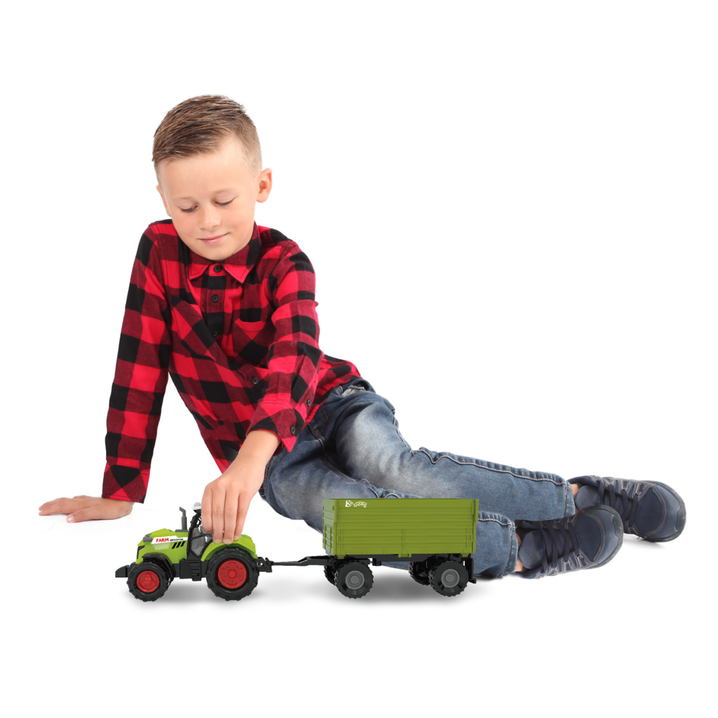 Moderní plastový farmářský traktor s vlečkou, hračka z kolekce Moje malá farma. Vlečka se dá jednoduše odpojit a otevřít. Traktor jezdí na volný chod a jeho délka je 10 cm. Přívěs je v délce 11 cm, celková délka včetně přívěsu je 25 cm. Zmáčknutím tlačítka na traktoru vydává reálné zvuky spolu...