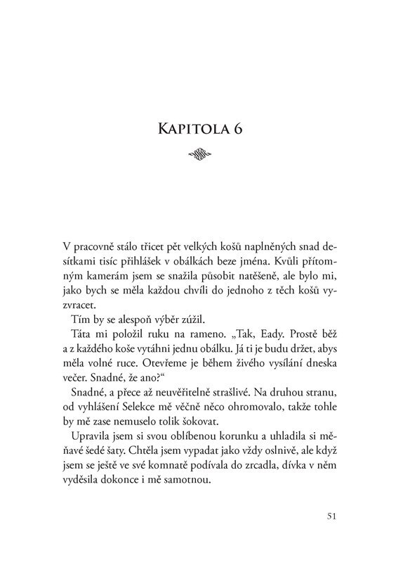 Princezna Eadlyn od malička poslouchala stále dokola o tom, jak se potkali její rodiče. Ona ovšem ani náhodou netouží opakovat romantický příběh svých rodičů! O svém životě však nerozhoduje sama. Její protesty jsou naprosto zbytečné, i ona si musí manžela vybrat v Selekci.