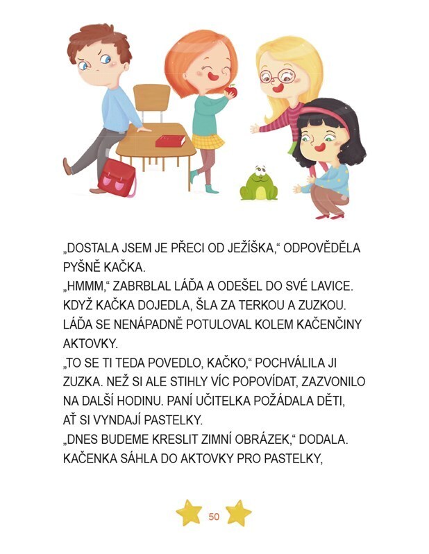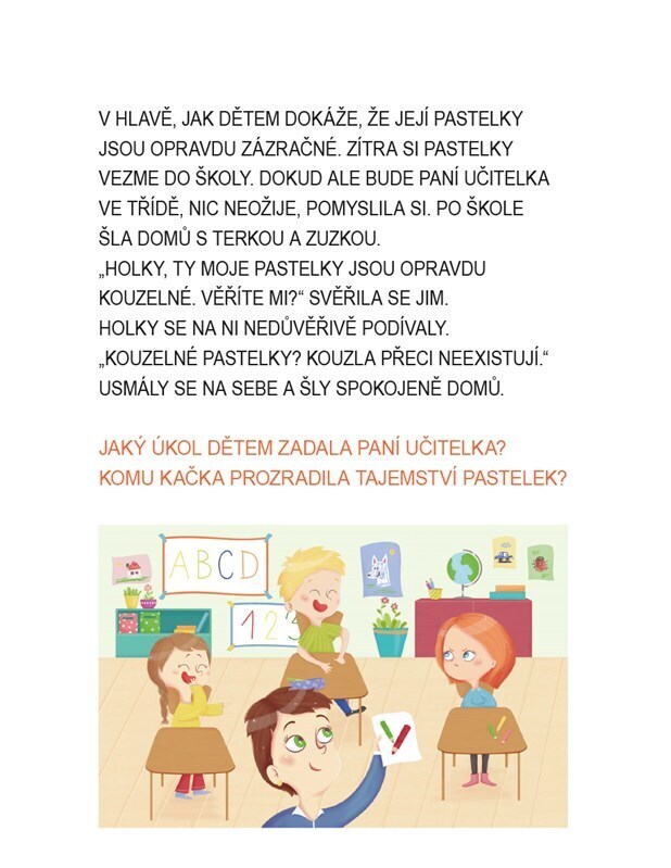 Kačenka si přála dárek, kterým ohromí všechny spolužačky. Když dostane jen obyčejné pastelky, je zklamaná. Jenže všechno je jinak – pastelky jsou kouzelné! Zažije s nimi spoustu legrace, a navíc pozná, co je to opravdové kamarádství. Vánoční příběh s krásnými ilustracemi je přizpůsobený...