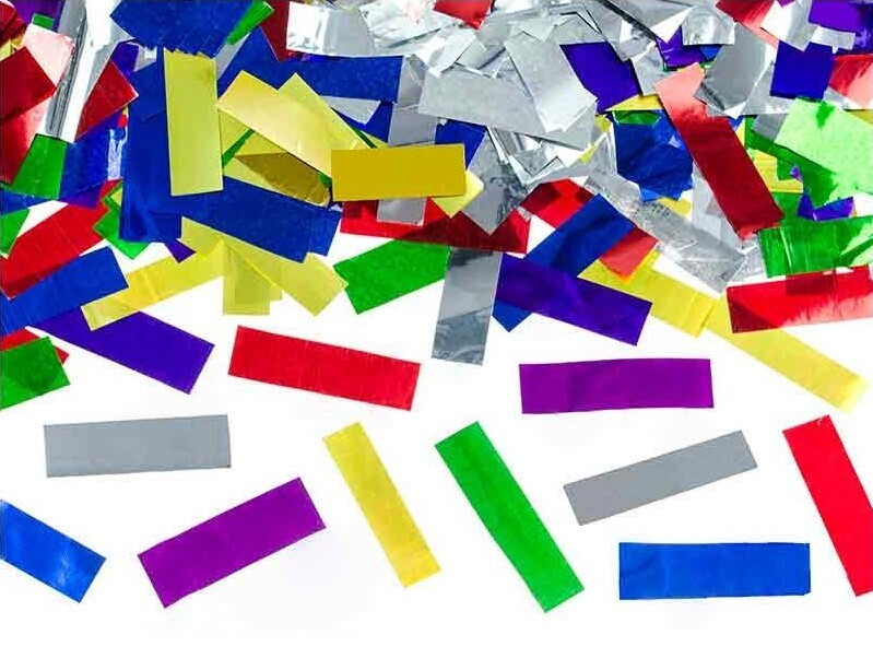 Konfety 40 cm, metalické barevné obdelníčky. Konfety jsou uloženy ve válcovité tubě. Drží se v ruce a ovládají se mechanickým pootočením tubusu. Po vystřelení vyletí barevné obdélníčky do výšky 5 až 8 metrů a rozptýlí se do okolí. Bezpečnost: konfety lze použít ve venkovních i vnitřních...