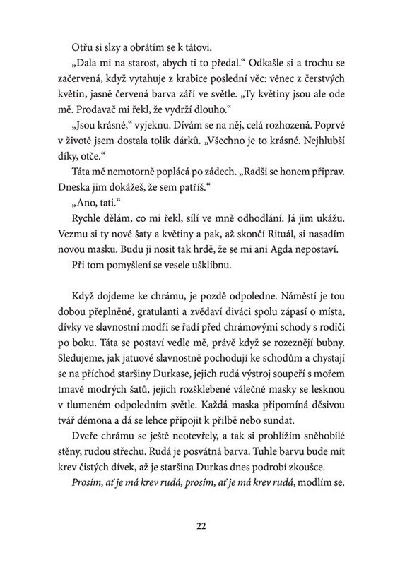 Šestnáctiletá Deka žije ve strachu. Během Rituálu čistoty musí prokázat, že se může stát plnohodnotnou členkou své vesnice. Když pak v den obřadu krvácí zlatě – démonickou barvou nečistoty – ví, že ji čeká něco horšího než smrt. Možnost uniknout strašlivému osudu přijde spolu se záhadnou ženou,...