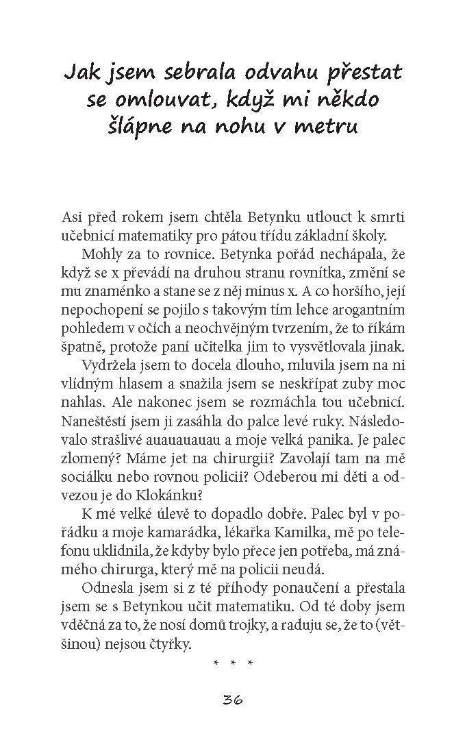 Tahle kniha není návod, jak se přestat bát. Já se například bojím spousty věcí. Bojím se otevírat dopisy s modrým pruhem, bojím se pavouků, zubaře, předjíždění na okresce, bojím se, že v práci přijdou na to, že ve skutečnosti nic neumím. Přišla jsem ale na to, že i když se strachu nezbavím,...