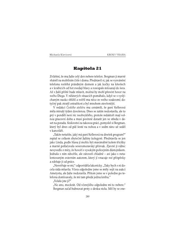 V pražském lesoparku byla v noci uškrcena mladá žena. Novinářka Julie Kellerová je zřejmě poslední, kdo s ní před vraždou mluvil. Oběť se navíc nápadně podobala její dceři Kláře. Byla to náhoda, nebo měl vrah spadeno na někoho jiného? Sympatický inspektor Josef Bergman rozkrývá složitý hlavolam...