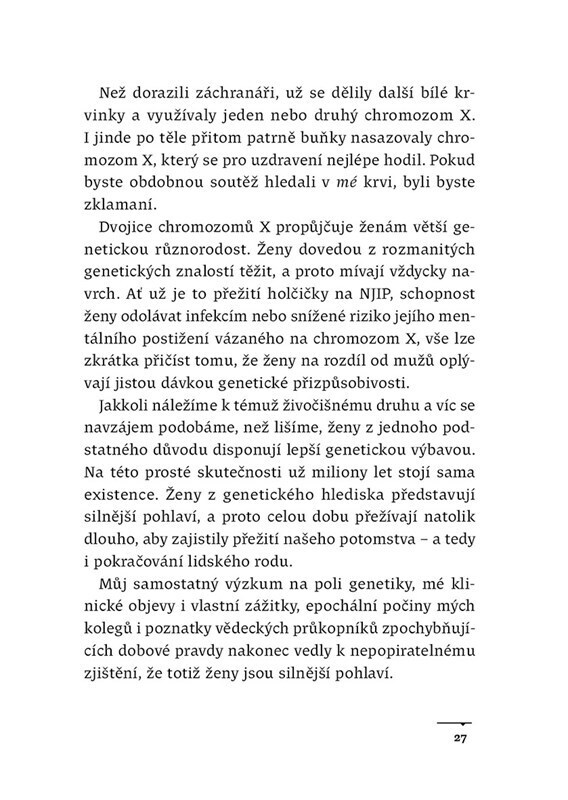 Ženy žijí déle než muži. Mají silnější imunitní systém. Dokážou se lépe vypořádat s nádorovým onemocněním i s hladem a vidí svět v širším barevném spektru. Ve všech fázích života si zkrátka vedou lépe než muži. Čím to je? A proč se nám vštěpuje opak? Oceňovaný lékař a vědec Shäron Moalem hledal...