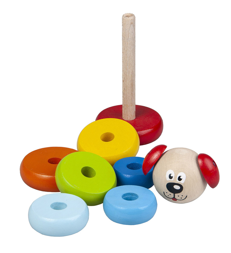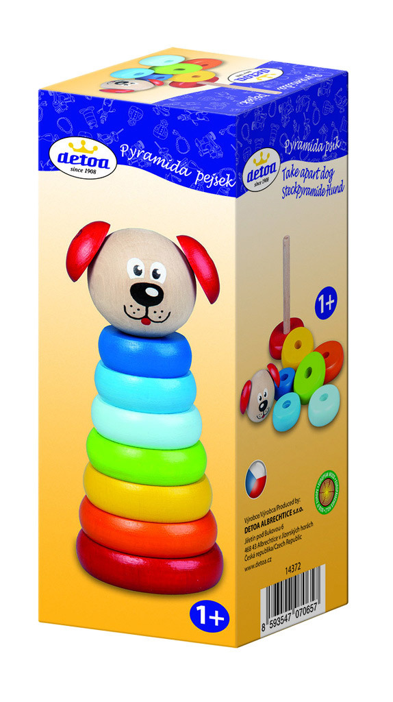 Dřevěná pyramida pejsek se skládá ze 7 navlékacích dílů a jednoho základního dílu s tyčkou. Výrobek je vhodný pro děti od 1 roku. Skládací pyramida pomáhá rozvíjet motoriku rukou a představivost dítěte. Baleno v papírové krabičce o rozměrech 65x65x175 mm.