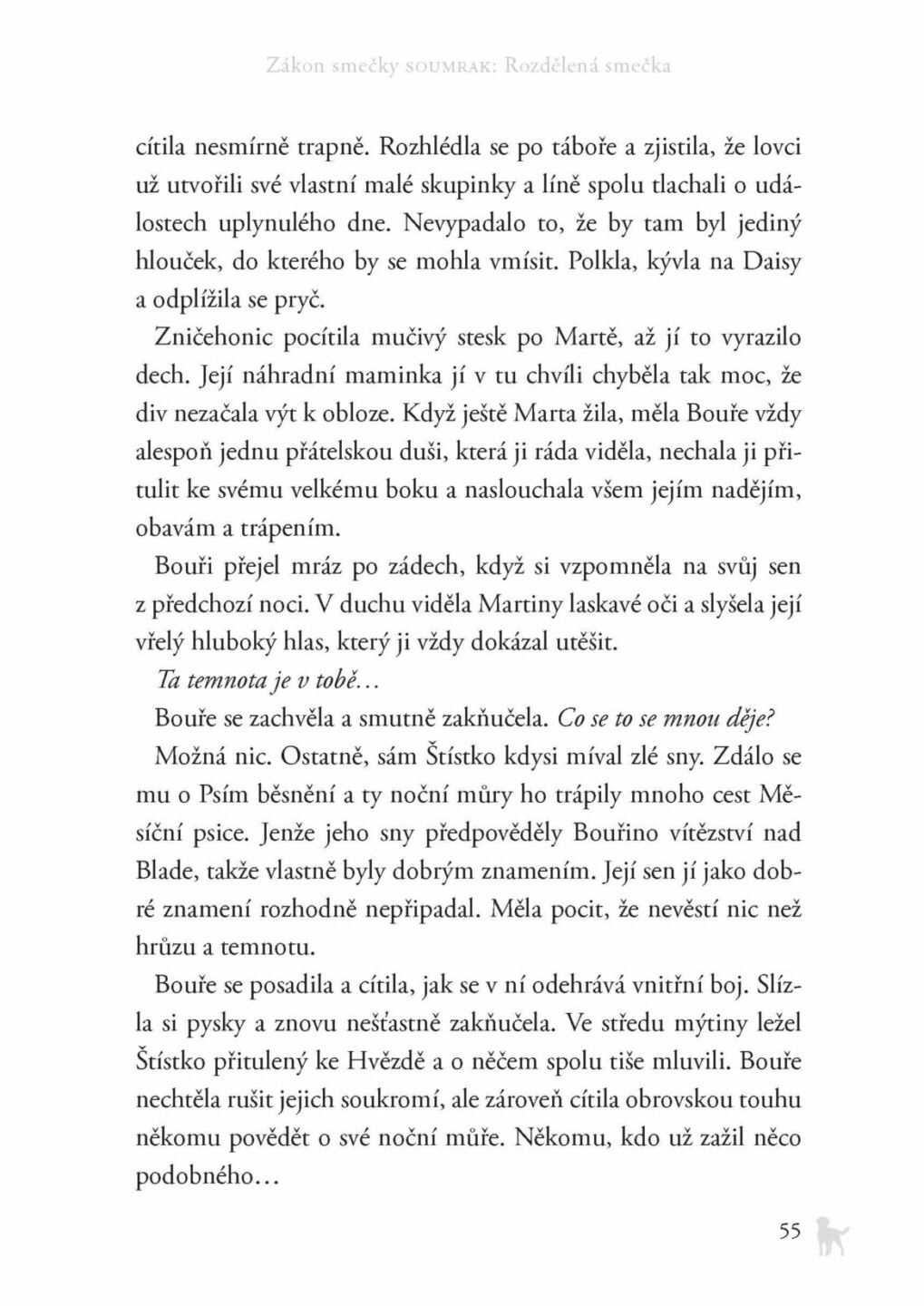 Podaří se nové Alfě udržet tlupu pospolu, nebo se znovu rozdělí? Mladá fenka Bouře celý svůj život usilovala o řádné místo v divoké smečce. Nyní se konečně cítí přijata, ale napětí v tlupě znovu stoupá. Někteří psi nejsou spokojeni s novou hierarchií a jiní stále nedůvěřují Bouři a Šípovi, kteří...