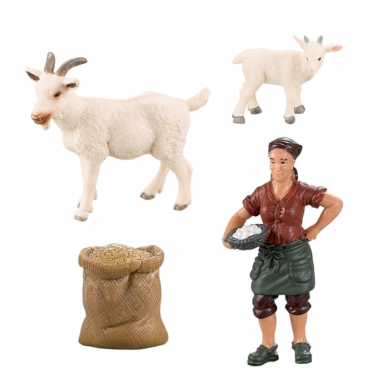 Farmářská zvířátka, která vypadají jako živá! Sada obsahuje kozu, kůzle a figurku farmářky, vše je vyrobeno z kvalitní, tvrdé gumy. Hračka je součástí kolekce Moje malá farma.