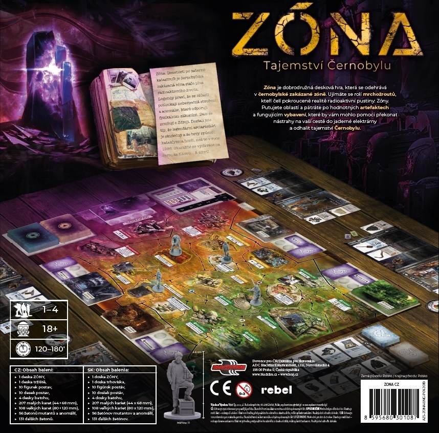 realitě radioaktivní pustiny: Zóny. Putujete oblastí a pátráte po hodnotných artefaktech a fungujícím vybavení, které by vám mohlo pomoci překonat nástrahy na vaší cestě do jaderné elektrárny a odhalit tajemství Černobylu. Obsah: 1 deska ZÓNY, 1 deska tržiště, 10 figurek