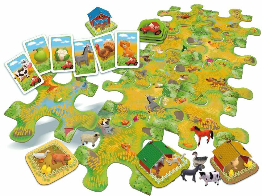 jako první získá 5 postaviček zvířat, nebo sesbírá 2 žetony s traktorem, vítězí! Obsah balení: 12 oboustranných dílku hry 50 karet 4 skládací stodoly 17 postaviček zvířat 5 žetonu s traktorem 1 česká a slovenská pravidla hry