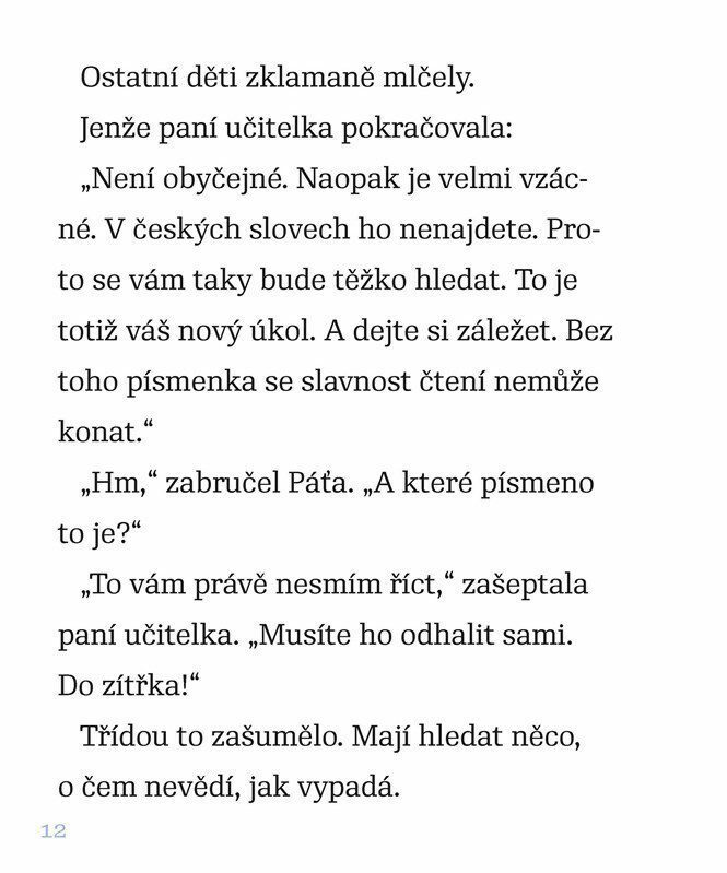 V 1. A se ztratilo jedno písmeno abecedy. To je nadělení, vždyť se brzy chystá písmenková slavnost! Odhodlaná šestice prvňáčků se rozhodne písmenko vypátrat, i když si vlastně nikdo nepamatuje, jak vypadá. A kde se nejlíp takové písmeno hledá? Přece v knihách a v knihovně. Ale snadné to...