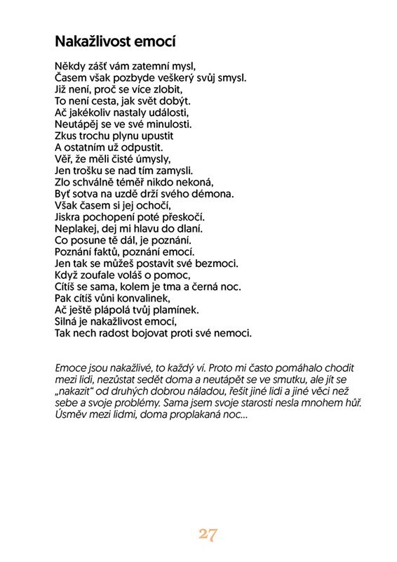 Tato sbírka básní nabízí koktejl z rulíku zlomocného i pohlazení po duši. Autorka v ní popisuje, čím si člověk projde po vážné kardiologické diagnóze a jaké je to jiné, když jste navíc sami kardiologem. Pokud je vaše nemoc genetická, můžete si klást otázku, zda jste stále plnohodnotným člověkem....