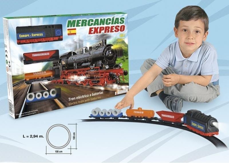 Nákladní vlak na baterie se světlem a se 3 druhy nákladních vagónů, který jezdí po trati dlouhé 2,94 m....