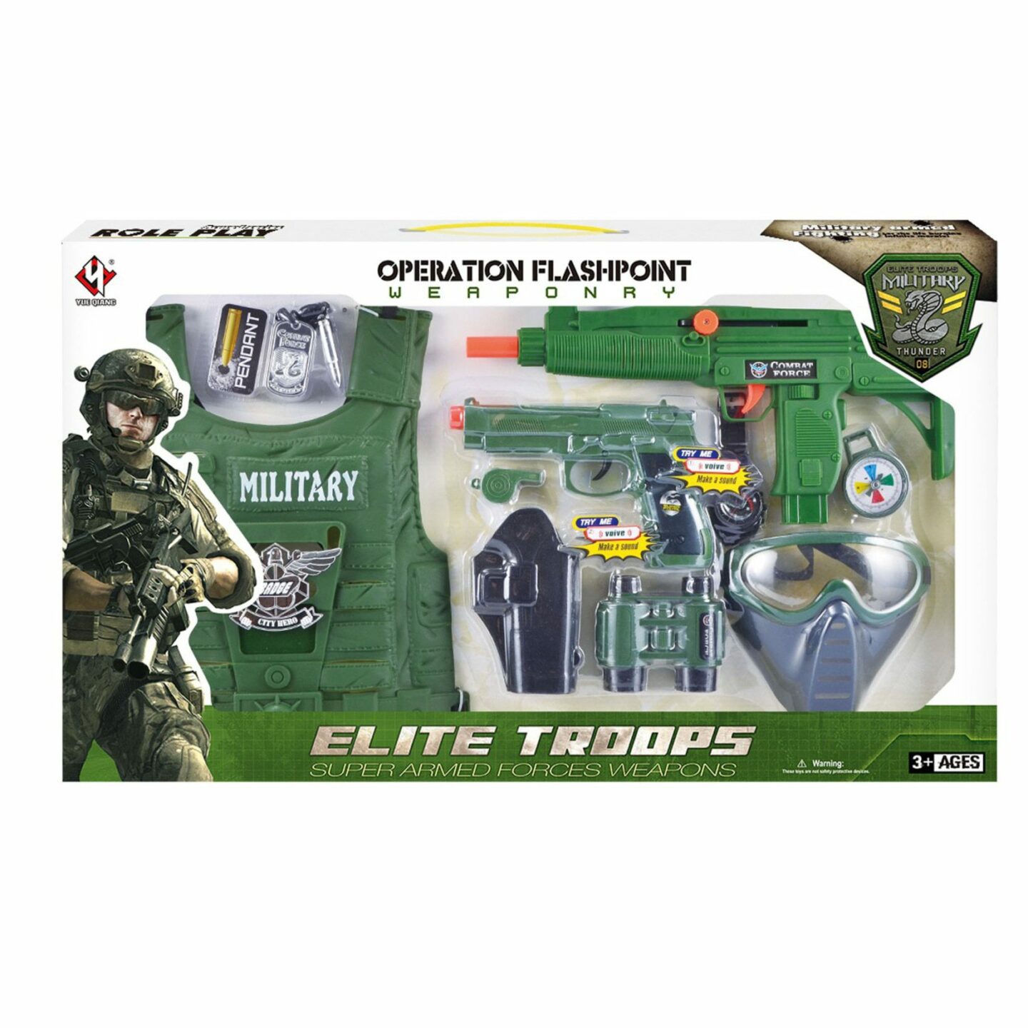 Zažij pořádnou vojenskou akci díky této mega skvělé sadě! Příslušenství, které budeš určitě potřebovat obsahuje vestu, odznak, ochrannou masku na obličej, kompas, dalekohled, hodinky, píšťalku a pistol s pouzdrem. Pistole obsahuje 3 ks baterií typu AG13, mačkáním spouště vydává...