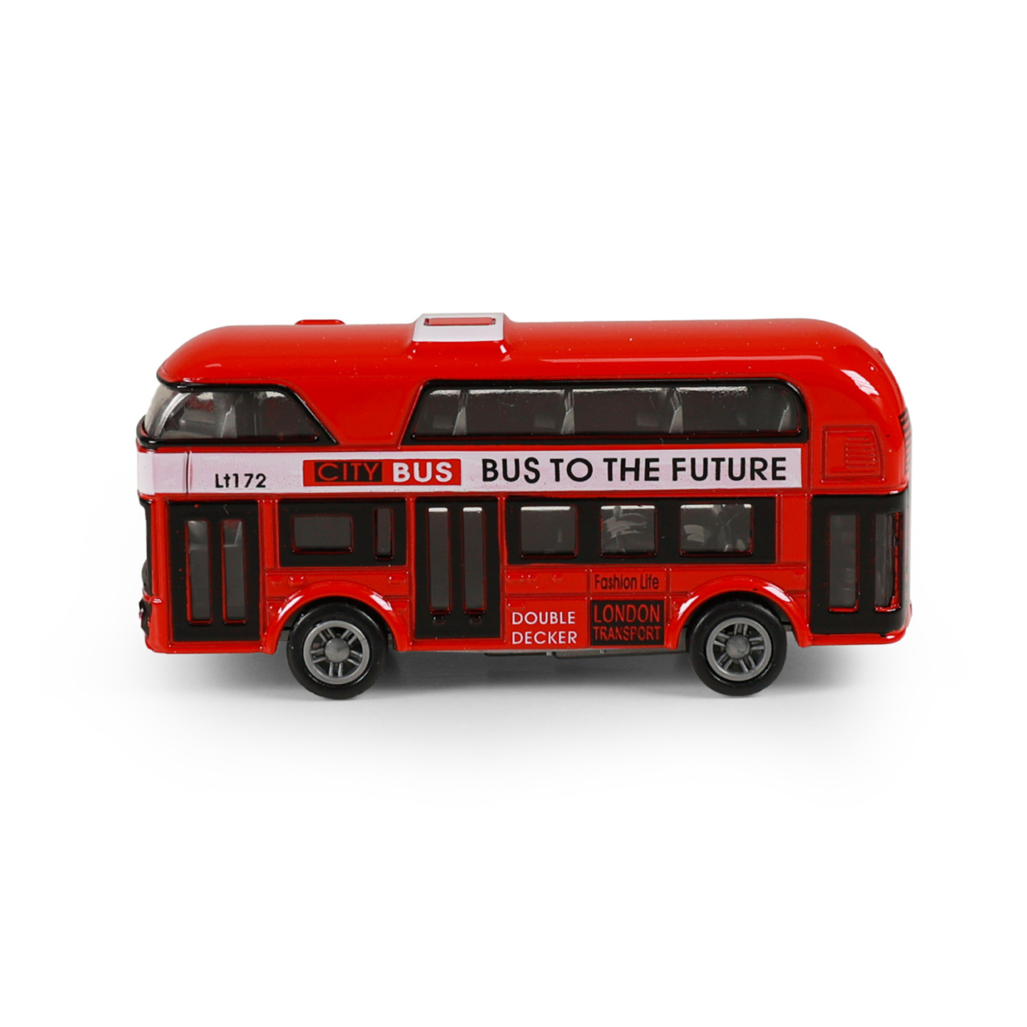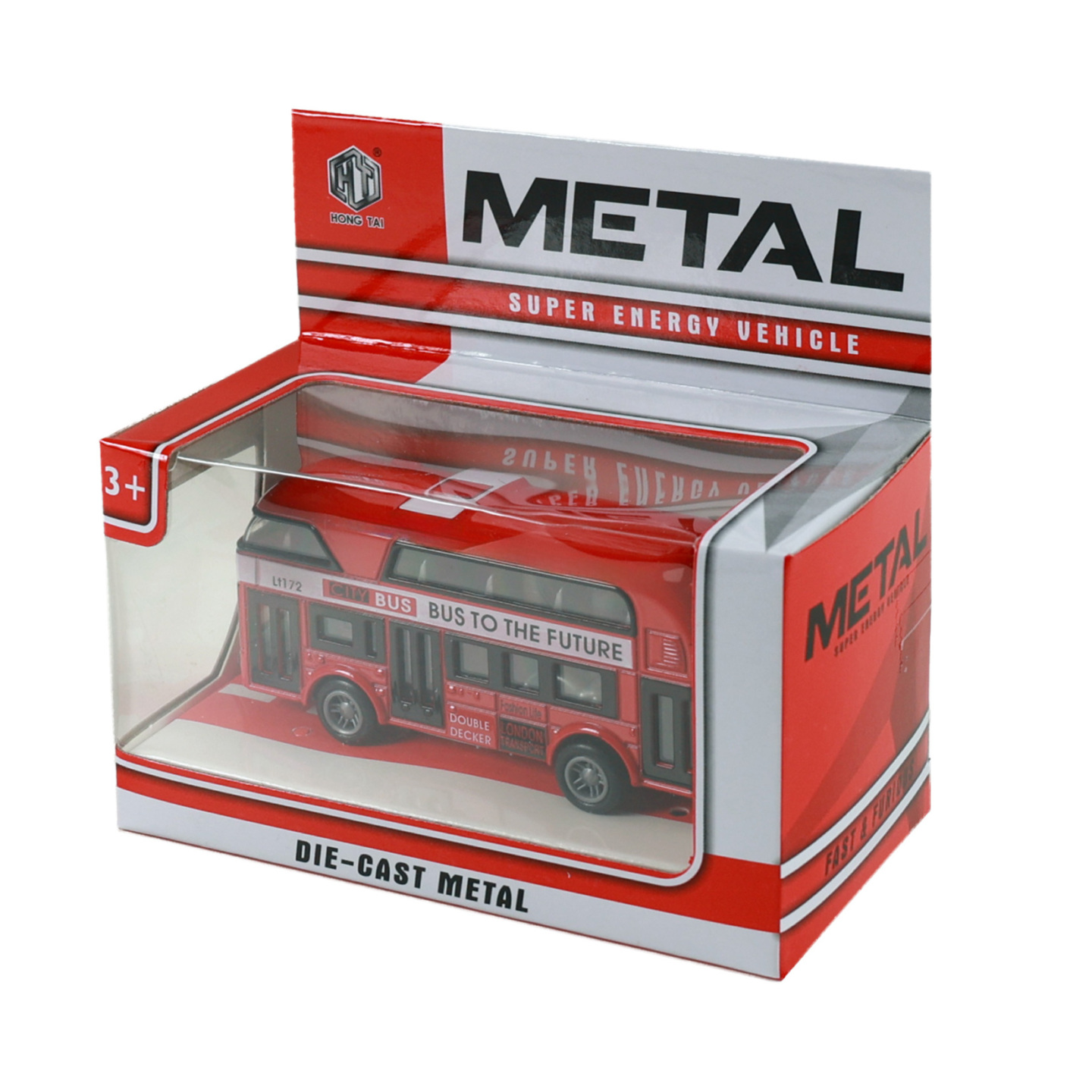 Autobus dvoupatrový, typický londýnský double decker je kovový a jezdí na zpětný chod. Délka cca 9,5 cm.