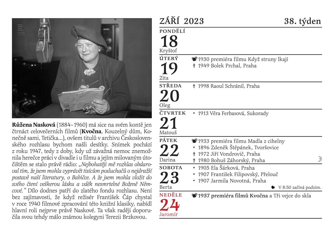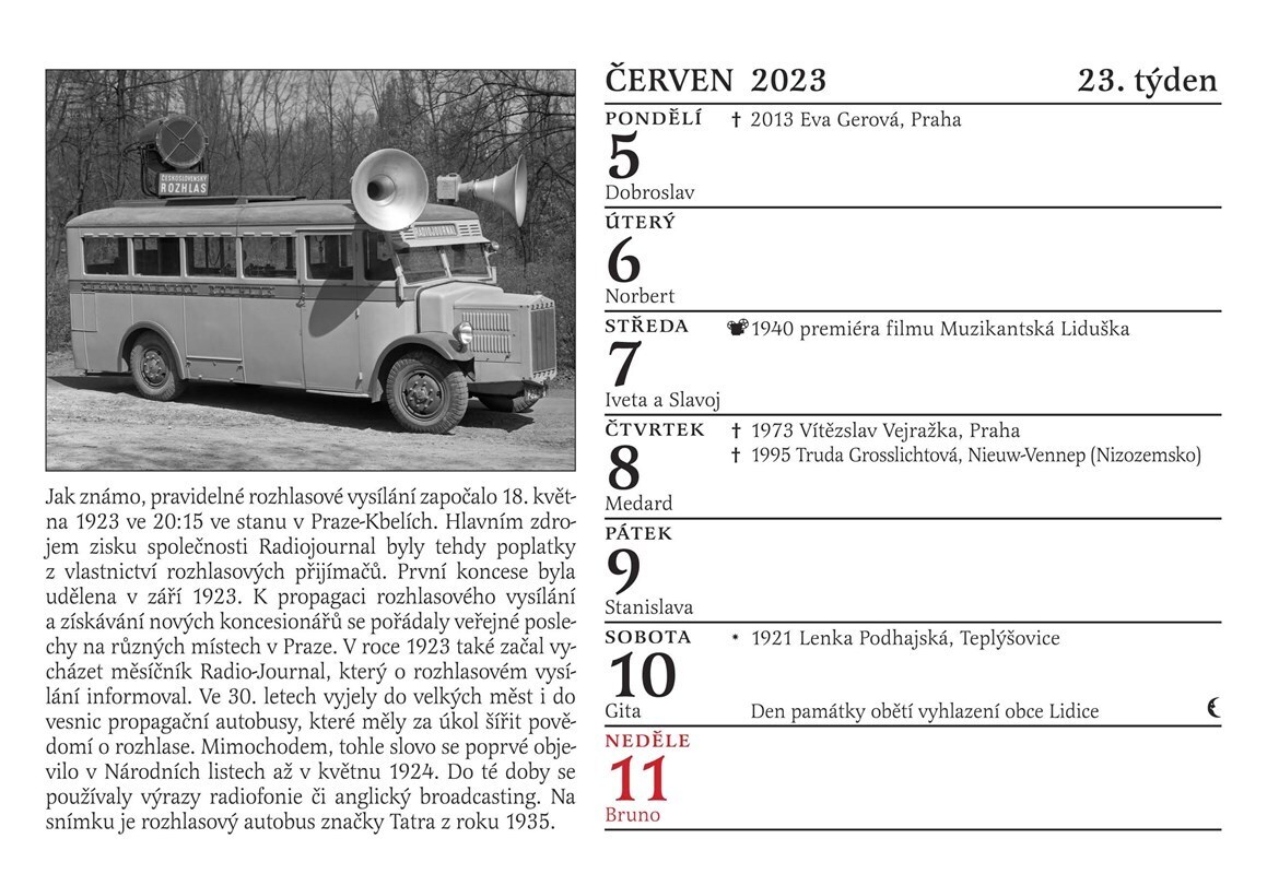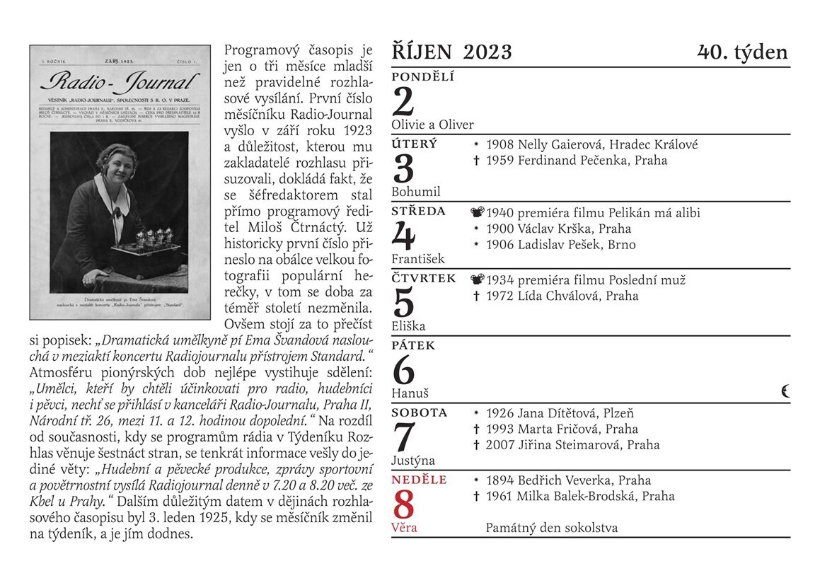 Tradiční Cibulkův pamětnický kalendář tentokrát potěší nejen všechny milovníky starých českých filmů, ale i rádia. Proč? Přesně před 100 lety se totiž u nás začala psát historie tohoto nesmrtelného média. Československo se tehdy stalo druhou evropskou zemí, která měla řádné rozhlasové vysílání....