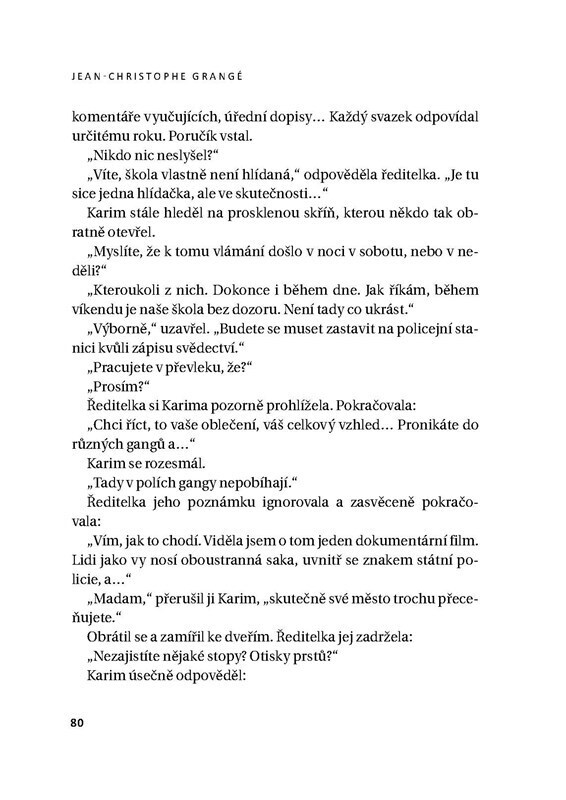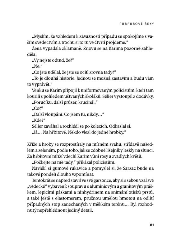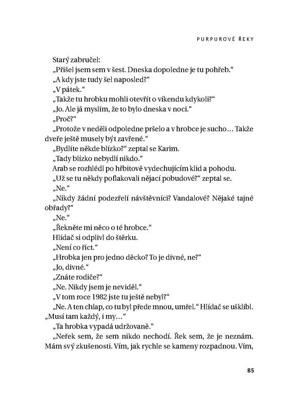 V prostředí skal a ledovců jsou postupně nalezena tři zmučená těla – všechna ve stejné, zvláštní pozici. Jedná se o promyšlené rituální vraždy, nebo o dílo šílence? Na druhém konci Francie dojde ke krádeži dvacet let staré školní kartotéky a podivnému vniknutí do místní hrobky. Vyšetřování vedou...