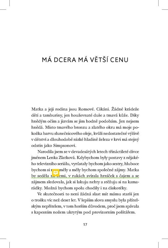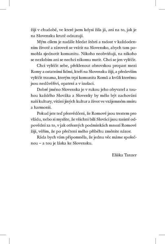 Narodila se třináctileté romské prostitutce z východoslovenského ghetta, její otec je německý neonacista vydělávající si na ilegálních zápasech. Těžko uvěřitelná rodinná situace Elišky Tanzer předznamenává její výjimečný osud – ve třinácti letech ji matka pošle do Anglie za lepším životem. I...
