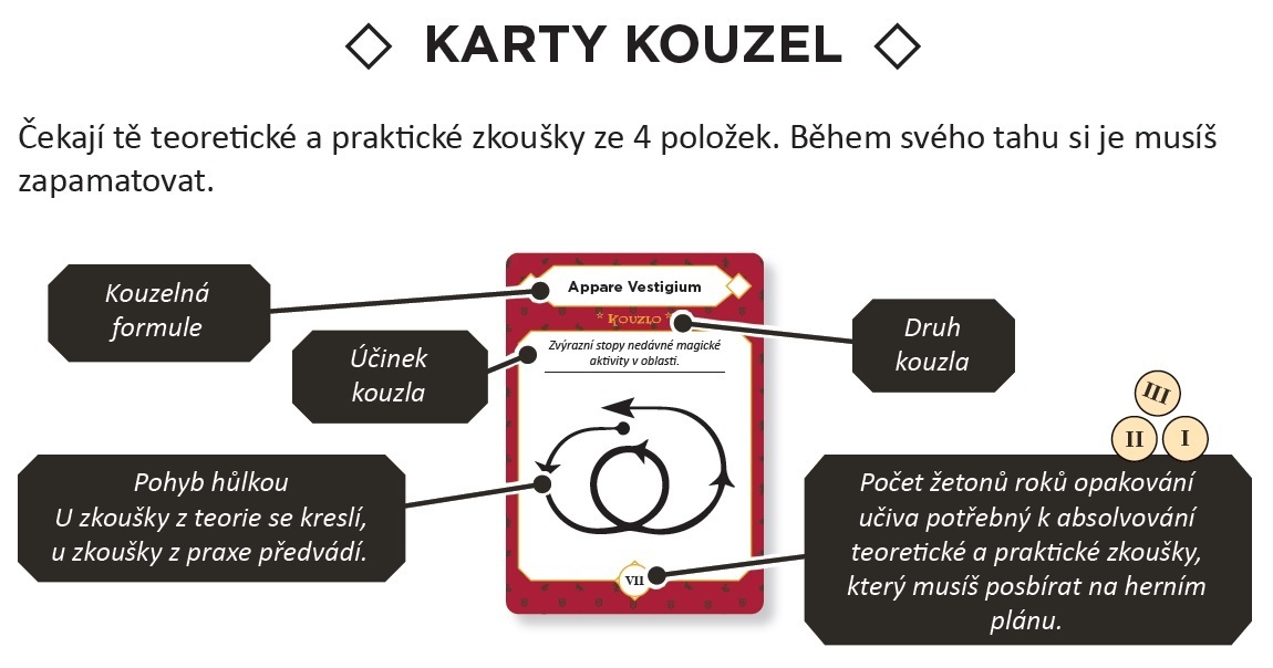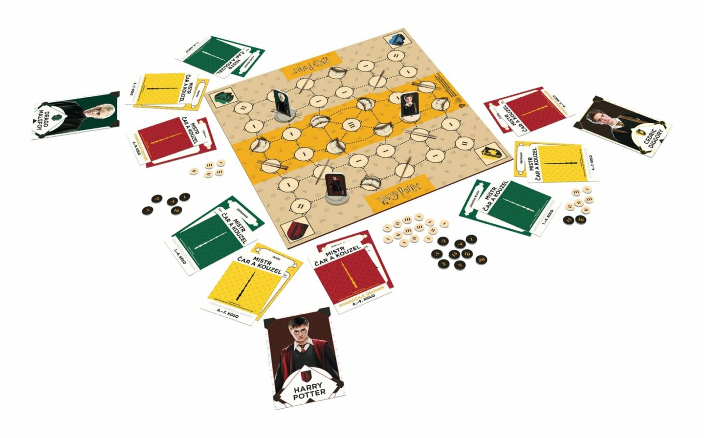 odříkávání formulí, kreslení i předvádění pantomimy. Obsah balení: 1 herní plán 218 karet kouzel 16 velkých karet 16 figurek postav 12 podstavců 104 žetonů bodů 32 žetonů roků 1 látkový sáček 1 česká a slovenská pravidla