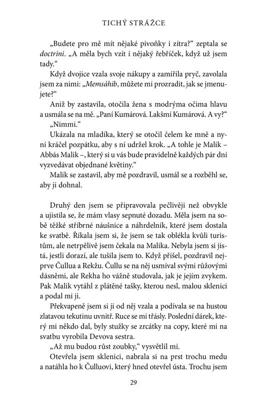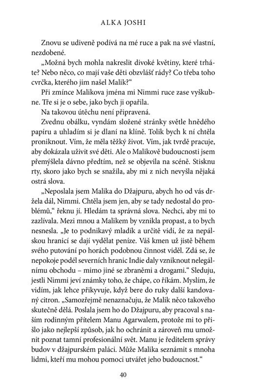 Pokračování příběhu Tajemství na kůži nás přivádí do života Lakšmí v době, kdy je šťastně vdaná a vede v Šimle bylinkovou zahradu. Malikovi je dvacet a právě se zamiloval. Jenže musí od své lásky odjet do Džajpuru na stáž v královském paláci. Ve městě jeho dětství se mnoho nezměnilo, moc a...